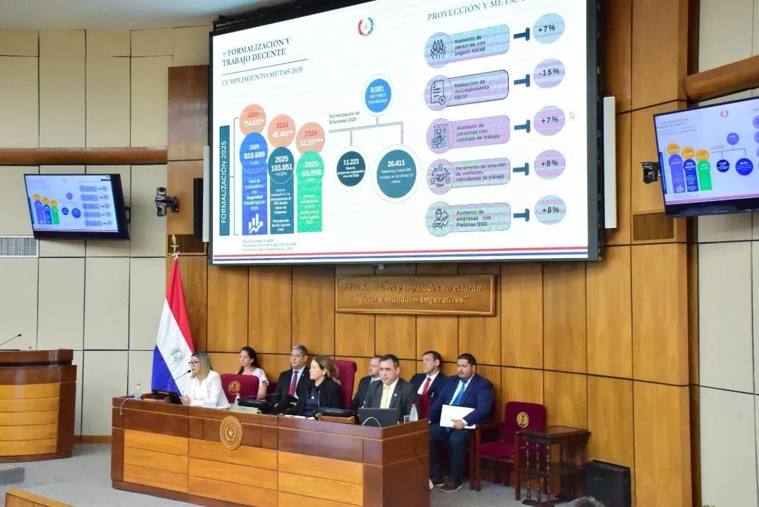 El Secretario Técnico del Sistema Nacional de Formación y Capacitación Laboral (SINAFOCAL), Alfredo Mongelós, acompañó a la ministra de Trabajo, Mónica Recalde, durante la presentación del Presupuesto General de la Nación 2026 ante la Comisión Bicameral de Presupuesto del Congreso Nacional, presidida por el senador Silvio “Beto” Ovelar y la vicepresidenta, la senadora Cristina Villalba.