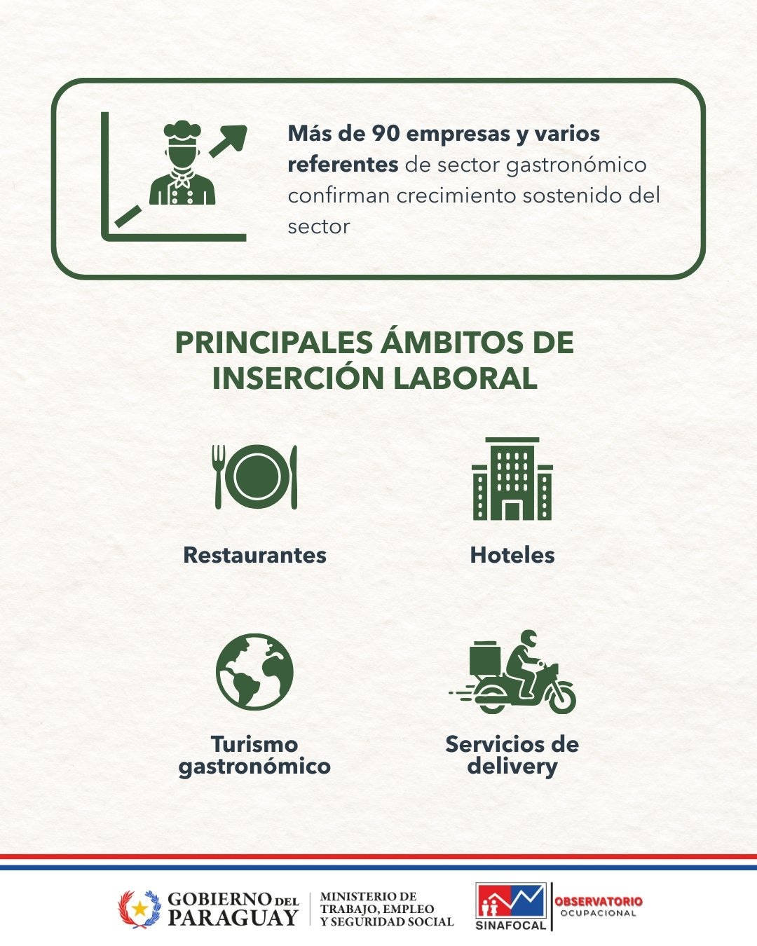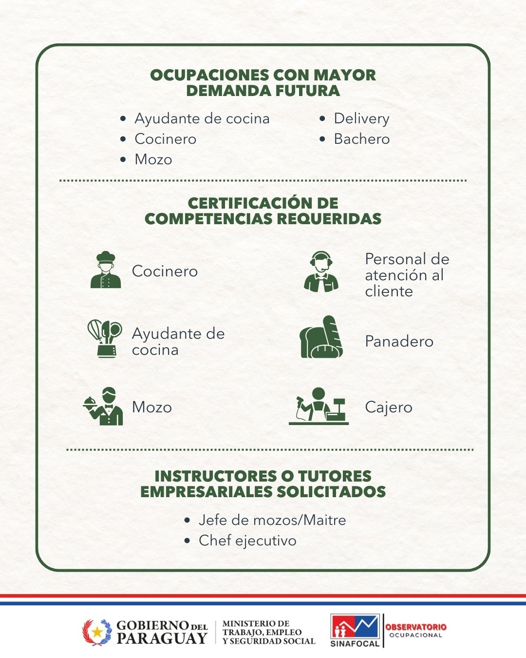 Le invitamos a ver en detalle los resultados y recomendaciones que buscan fortalecer la gastronomía como motor de desarrollo económico y cultural en Paraguay https://sinafocal.gov.py/observatorio-post/gastronomia-demanda-ocupacional-y-competencias-laborales/